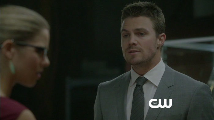 Thanks to Mr. Video, we have screen captures from a preview clip for the episode, featuring Stephen Amell (Oliver), Emily Bett Rickards (Felicity), and David Ramsey (Diggle). We, too, would like to know how Felicity is able to hold Diggle down here, but maybe it’s a lot calmer in the clip itself.