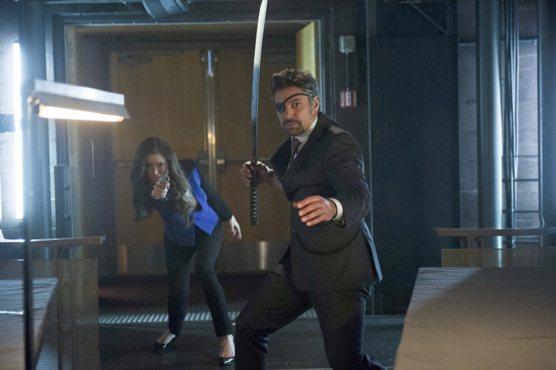 Arrow -- "The Man Under the Hood" -- Image AR219b_0183b -- Pictured (L-R): Summer Glau as Isabel Rochev and Manu Bennett as Slade Wilson -- Photo: Diyah Pera/The CW -- © 2014 The CW Network, LLC. All Rights Reserved.