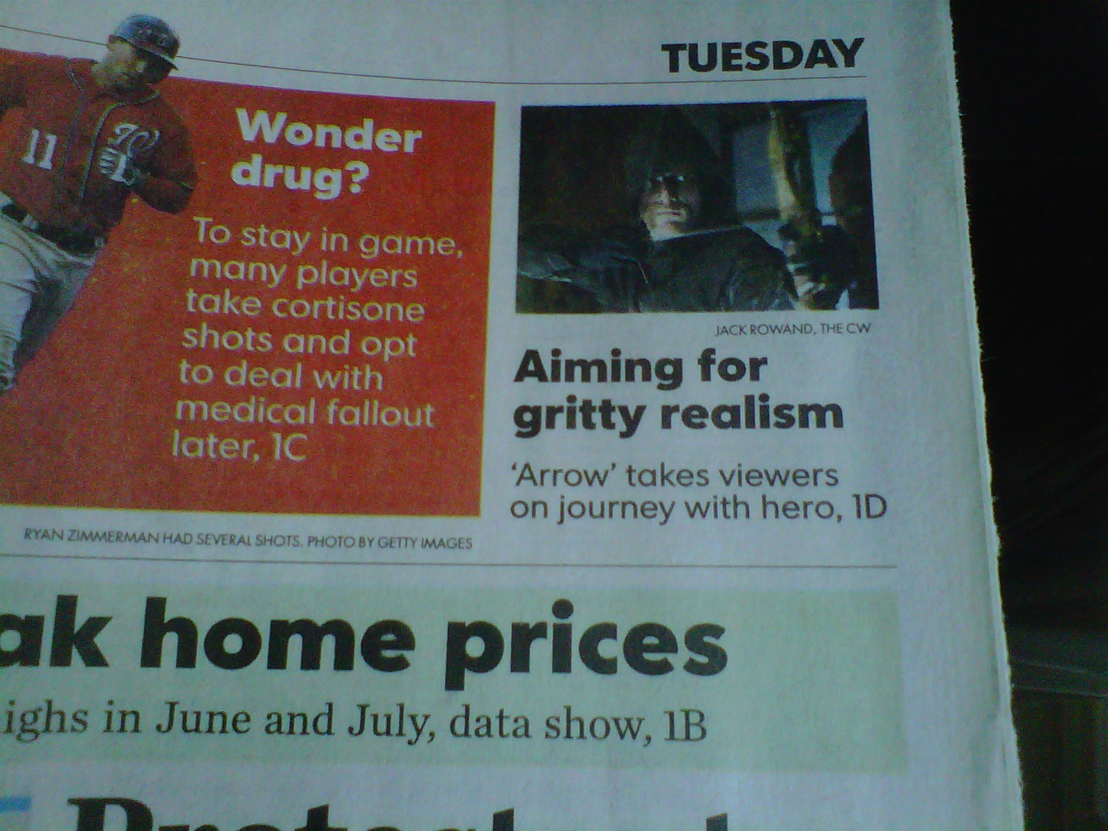This morning we woke up to an e-mail from reader Ryan Poehler with something quite cool from today’s (October 9) USA Today — A HUGE Arrow feature, complete with what looks like a new photo… if it’s not new, I just don’t recognize it. It looks like Arrow takes up most of the paper’s Life section.