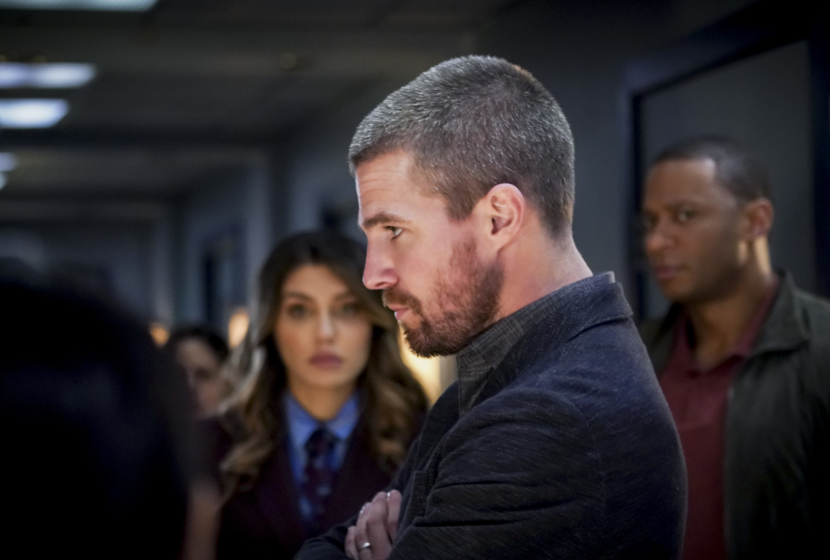 Arrow -- "Emerald Archer" -- Image Number: AR712A_0066b -- Pictured (L-R): Juliana Harkavy as Dinah Drake/Black Canary, Stephen Amell as Oliver Queen/Green Arrow and David Ramsey as John Diggle/Spartan -- Photo: Shane Harvey/The CW -- é 2019 The CW Network, LLC. All Rights Reserved.