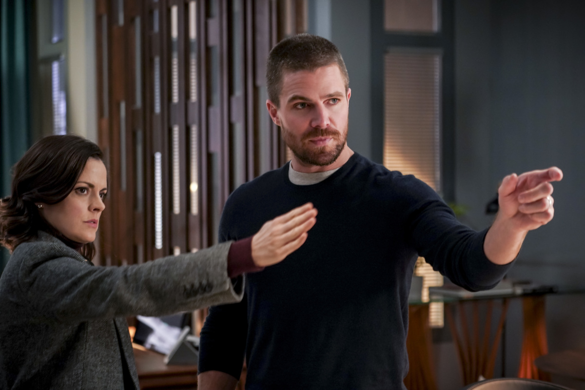 Arrow -- "Emerald Archer" -- Image Number: AR712A_0076b -- Pictured (L-R): Jessica Heafey as Documentarian and Stephen Amell as Oliver Queen/Green Arrow -- Photo: Shane Harvey/The CW -- © 2019 The CW Network, LLC. All Rights Reserved.