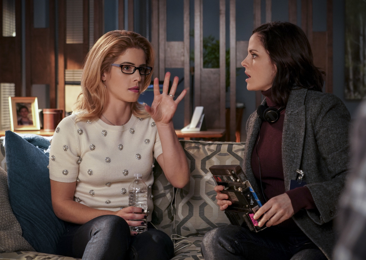 Arrow -- "Emerald Archer" -- Image Number: AR712A_0117b -- Pictured (L-R): Emily Bett Rickards as Felicity Smoak and Jessica Heafey as Documentarian -- Photo: Shane Harvey/The CW -- © 2019 The CW Network, LLC. All Rights Reserved.