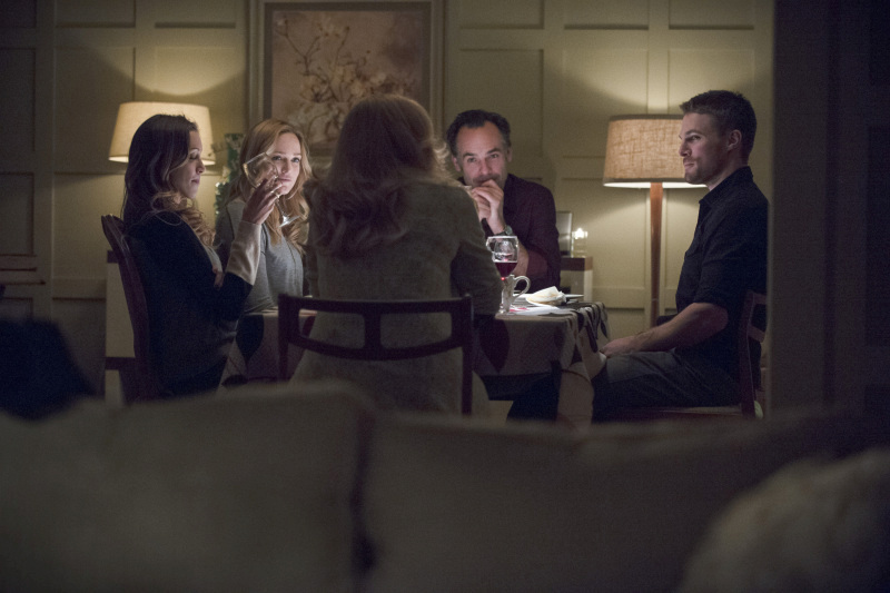 Arrow -- "Time of Death" -- Image AR214a_0306b -- Pictured (L-R): Katie Cassidy as Laurel Lance, Caity Lotz as Sara Lance, Alex Kingston as Dinah Lance, Paul Blackthorne as Quentin Lance, and Stephen Amell as Oliver Queen -- Photo: Cate Cameron/The CW -- © 2014 The CW Network, LLC. All Rights Reserved.