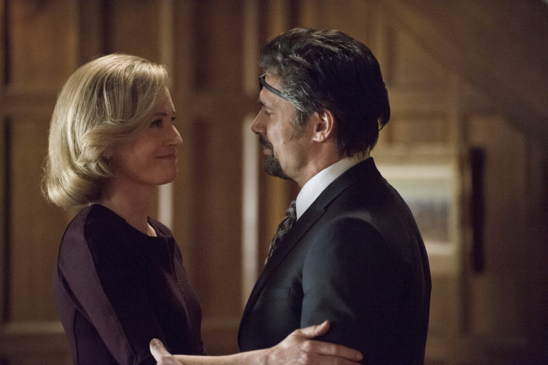 Stephen Amell and Manu Bennett have to play those current beats with so much history, stuff they might not fully know yet, and they do so with aplomb. Amell, in particular, looked like a caged cat, both prepared to strike but also waiting for provocation. It’s damn fascinating that Oliver would even consider killing Slade right then and there and have any way of plausibly explaining that to Moira should she return to find the dead body. Both actors are given remarkably meaty ranges to play with here, clearly defining both pre-and post-knowledge selves in the past, as well as coiled and locked enemies of the present. Each knocks it out of the park, and so much of the tension of the episode is believable because it lies within their performances.