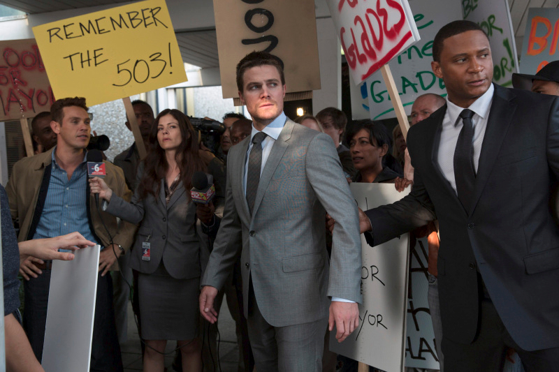 Arrow -- "Identity" -- Image AR202a_8819b -- Pictured (L-R): Kevin Alejandro as Sebastian Blood, Stephen Amell as Oliver Queen, and David Ramsey as John Diggle -- Photo: Jack Rowand/The CW -- © 2013 The CW Network. All Rights Reserved