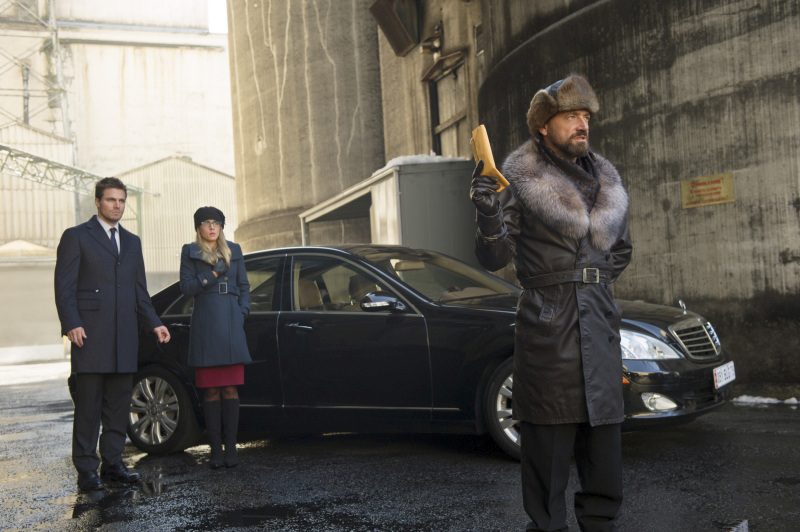 Arrow -- "Keep Your Enemies Closer" -- Image AR206a_0072b -- Pictured (L-R): Stephen Amell as Oliver Queen, Emily Bett Rickards as Felicity Smoak, and David Nykl as Knyazev -- Photo: Diyah Pera/The CW -- © 2013 The CW Network, LLC. All Rights Reserved