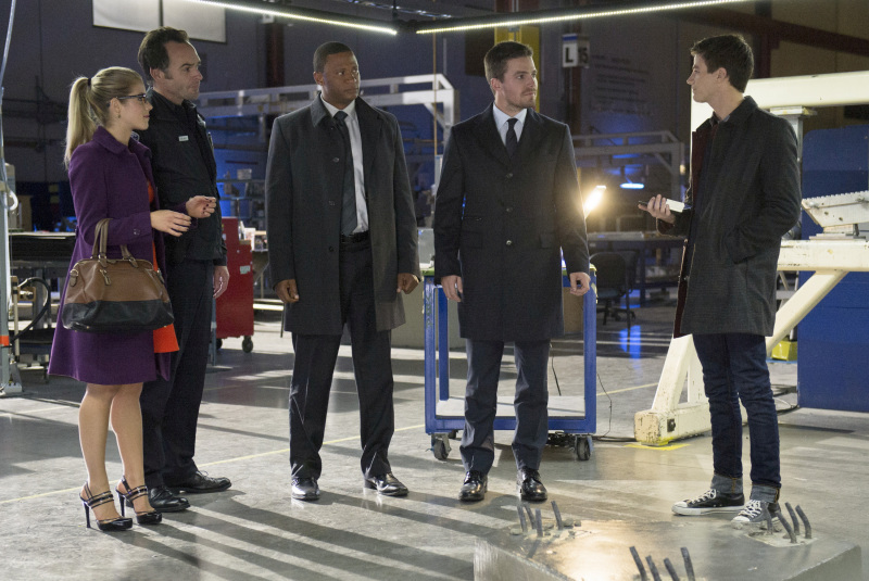 Arrow -- "The Scientist" -- Image AR208b_0275b -- Pictured (L-R): Emily Bett Rickards as Felicity Smoak, Paul Blackthorne as Quentin Lance, David Ramsey as John Diggle, Stephen Amell as Oliver Queen, and Grant Gustin as Barry Allen -- Photo: Cate Cameron/The CW -- © 2013 The CW Network. All Rights Reserved