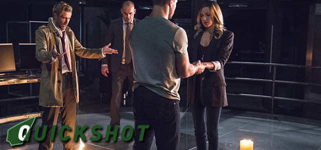 At the bunker, Constantine has somehow made it to Star City within no time of Oliver calling. Either he was in town, close to town, or he mystically teleported himself there. (Maybe he called on Manny the angel to whisk him away there.) Whatever the case, he’s here with little fanfare on the same night they captured Sara and he’s got a plan for a restitutionum – a soul innie rather than a demon outtie. They ask if he’s done one before and he says it’s been about a year since his last, which could be a reference to the Constantine episode “The Rage of Caliban,” in which John had to exorcise an evil spirit possessing a little boy and return it to its own body, a catatonic man in a mental hospital.