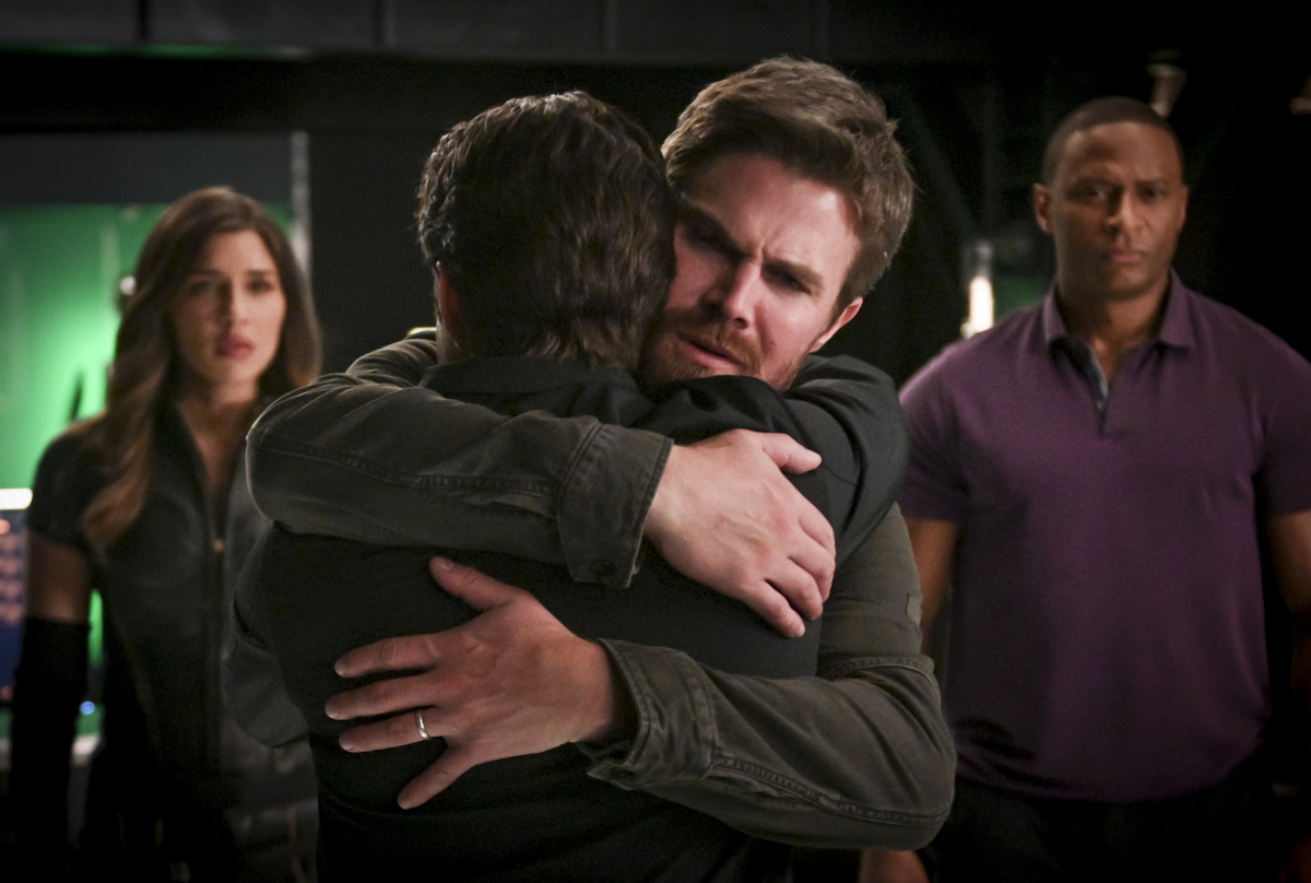 The CW has released some photos from the fourth episode of Arrow Season 8 which appears to be a tribute to Seasons 5 & 6 as we see “New Team Arrow” with Oliver, Diggle and Laurel in “Present Tense.” Oh, and Echo Kellum is back as Curtis!