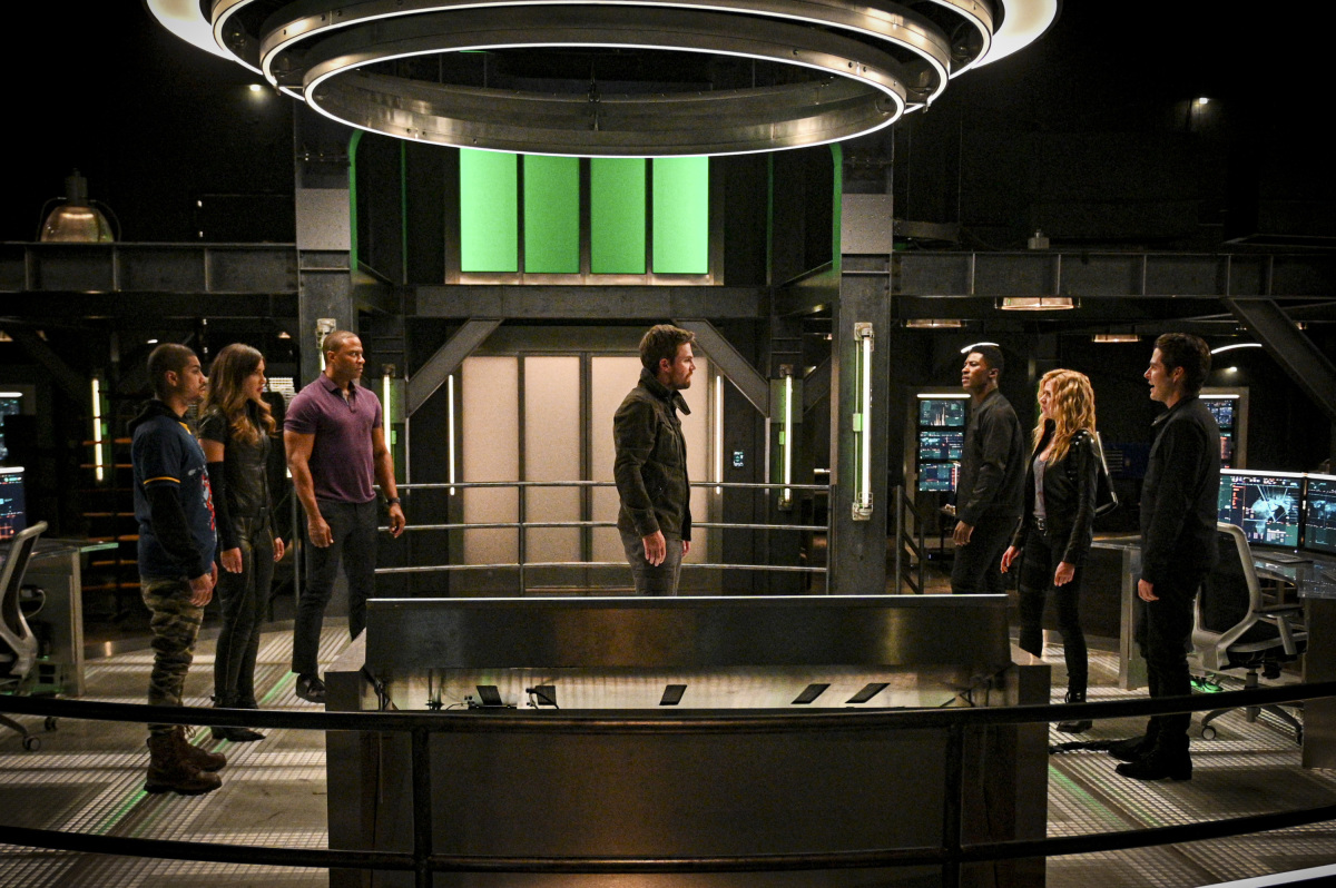 Arrow -- "Present Tense" -- Image Number: AR804a_0475b.jpg -- Pictured (L-R): Rick Gonzalez as Rene Ramirez/Wild Dog, Juliana Harkavy as Dinah Drake/Black Canary, David Ramsey as John Diggle/Spartan, Stephen Amell as Oliver Queen/Green Arrow, Joseph David-Jones as Connor Hawke, Katherine McNamara as Mia and Ben Lewis as William Clayton -- Photo: Sergei Bachlakov/The CW -- © 2019 The CW Network, LLC. All Rights Reserved.