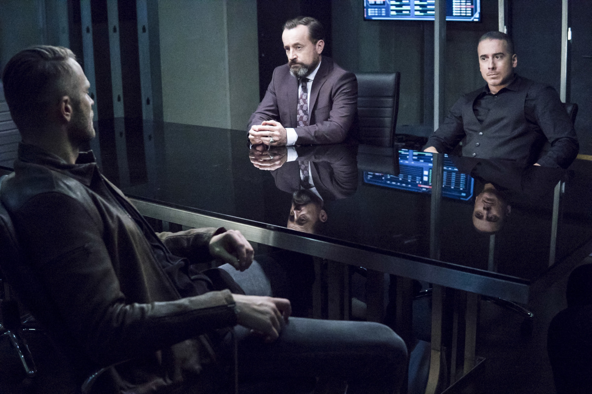 Arrow -- "All for Nothing" -- Image Number: AR612b_0470.jpg -- Pictured (L-R): Johann Urb as Sonny Pederson, David Nykl as Anatoly Knyazev and Kirk Acevedo as Ricardo Diaz -- Photo: Colin Bentley/The CW -- © 2018 The CW Network, LLC. All rights Reserved.