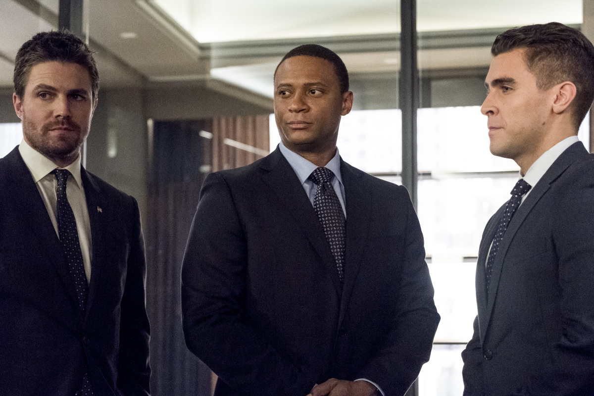 Arrow -- "Bratva" -- Image AR512a_0184b.jpg -- Pictured (L-R): Stephen Amell as Oliver Queen, David Ramsey as John Diggle, and Josh Segarra as Adrian Chase -- Photo: Cate Cameron/The CW -- © 2017 The CW Network, LLC. All Rights Reserved.