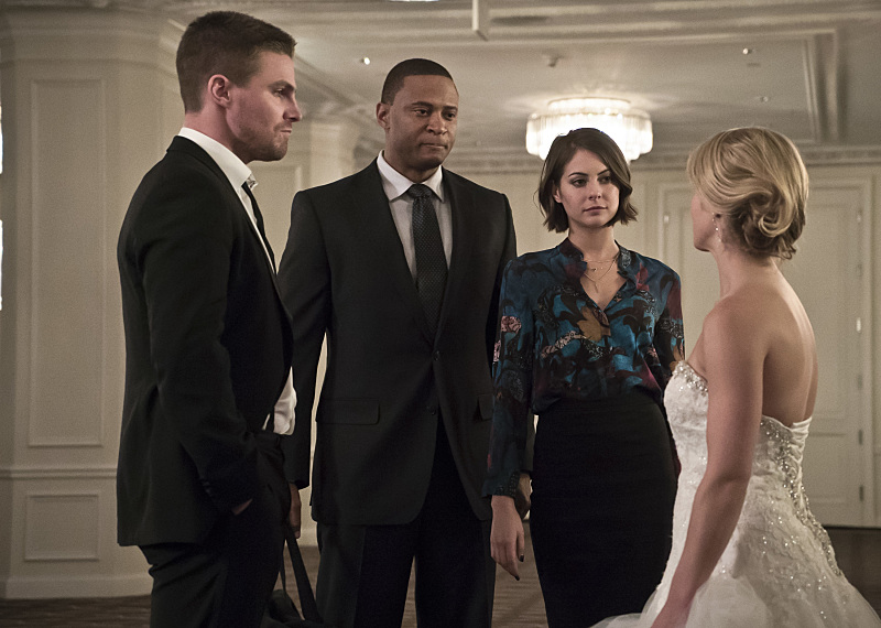 Arrow -- "Broken Hearts" -- Image AR416a_0300b.jpg -- Pictured (L-R): Stephen Amell as Oliver Queen, David Ramsey as John Diggle, Willa Holland as Thea Queen and Emily Bett Rickards as Felicity Smoak -- Photo: Katie Yu/The CW -- é 2016 The CW Network, LLC. All Rights Reserved.
