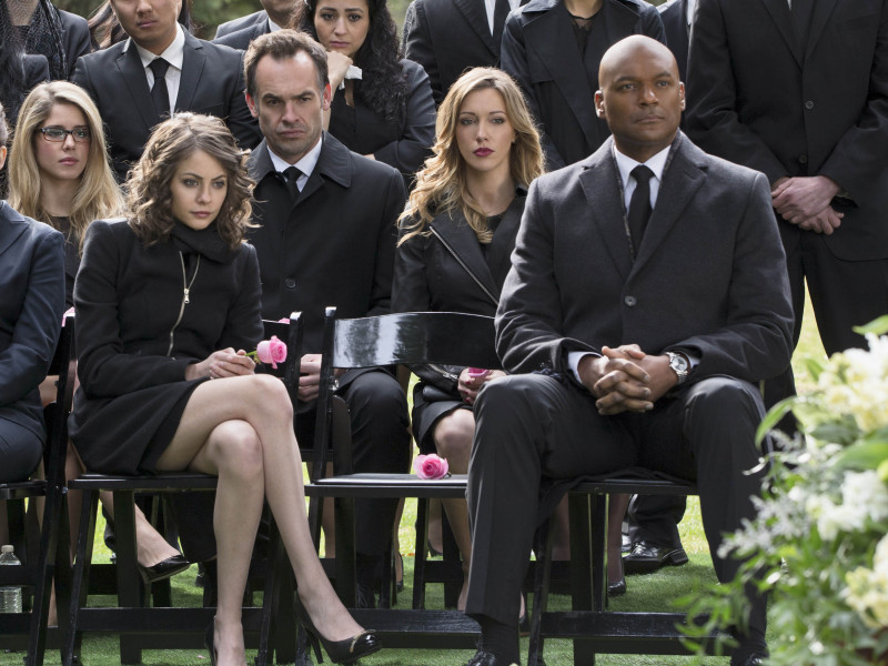 Arrow -- "City of Blood" -- Image AR221b_0021b -- Pictured (L-R): Emily Bett Rickards as Felicity Smoak, Willa Holland as Thea Queen, Paul Blackthorne as Quentin Lance, Katie Cassidy as Laurel Lance, and Colin Salmon as Walter Steele -- Photo: Jack Rowand /The CW -- © 2014 The CW Network, LLC. All Rights Reserved.