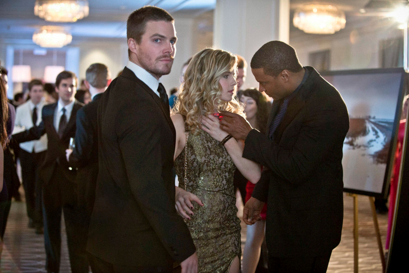 Arrow -- "Dodger" -- Image AR115a_0096b -- Pictured (L-R): Stephen Amell as Oliver Queen, Emily Bett Rickards as Felicity Smoak and David Ramsey as John Diggle -- Photo: Cate Cameron/The CW -- © 2013 The CW Network. All Rights Reserved