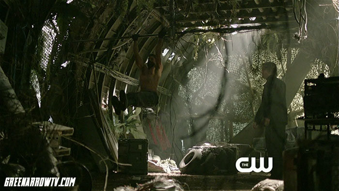 The clip features Stephen Amell as a not quite as fit Oliver and Manu Bennett as Slade Wilson, pulling shirtless duty since Oliver wasn’t quite so built back in the time of the island.