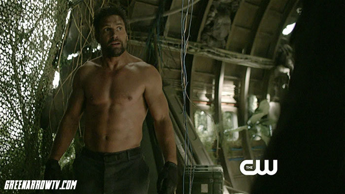 The clip features Stephen Amell as a not quite as fit Oliver and Manu Bennett as Slade Wilson, pulling shirtless duty since Oliver wasn’t quite so built back in the time of the island.