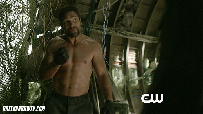 The clip features Stephen Amell as a not quite as fit Oliver and Manu Bennett as Slade Wilson, pulling shirtless duty since Oliver wasn’t quite so built back in the time of the island.