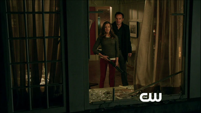 The return episode is called “Home Invasion,” and guest stars include Michael Rowe as Deadshot/Floyd Lawton and J. August Richards of Angel fame as a character we don’t know about yet. They both show up in the screen captures, as does a shirtless Oliver (Stephen Amell). Colton Haynes is also back as Roy Harper!