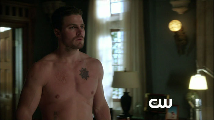 The return episode is called “Home Invasion,” and guest stars include Michael Rowe as Deadshot/Floyd Lawton and J. August Richards of Angel fame as a character we don’t know about yet. They both show up in the screen captures, as does a shirtless Oliver (Stephen Amell). Colton Haynes is also back as Roy Harper!