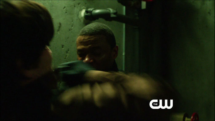 The return episode is called “Home Invasion,” and guest stars include Michael Rowe as Deadshot/Floyd Lawton and J. August Richards of Angel fame as a character we don’t know about yet. They both show up in the screen captures, as does a shirtless Oliver (Stephen Amell). Colton Haynes is also back as Roy Harper!