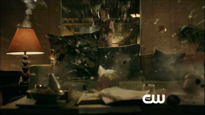 The return episode is called “Home Invasion,” and guest stars include Michael Rowe as Deadshot/Floyd Lawton and J. August Richards of Angel fame as a character we don’t know about yet. They both show up in the screen captures, as does a shirtless Oliver (Stephen Amell). Colton Haynes is also back as Roy Harper!