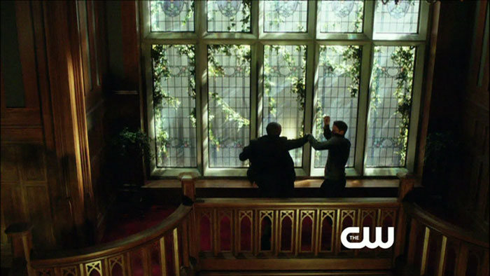 The return episode is called “Home Invasion,” and guest stars include Michael Rowe as Deadshot/Floyd Lawton and J. August Richards of Angel fame as a character we don’t know about yet. They both show up in the screen captures, as does a shirtless Oliver (Stephen Amell). Colton Haynes is also back as Roy Harper!