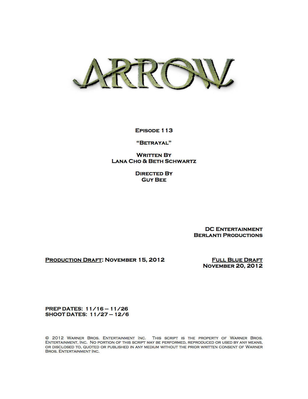 Thanks to Marc Guggenheim on Twitter, here are the credits for the 13th episode of Arrow, titled “Betrayal” and airing next year.