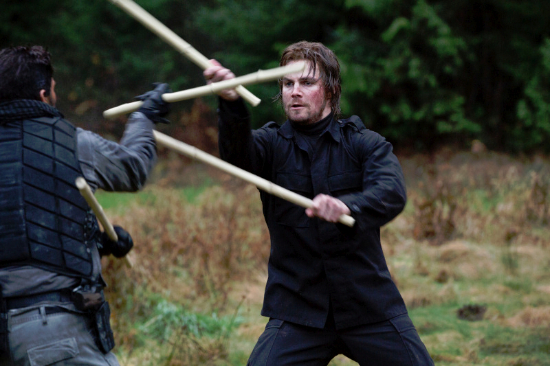 Arrow -- "The Odyssey" -- Image AR114b_8425b -- Pictured (L-R): Manu Bennett as Slade Wilson and Stephen Amell as Oliver Queen -- Photo: Jack Rowand/The CW -- © 2013 The CW Network. All Rights Reserved.