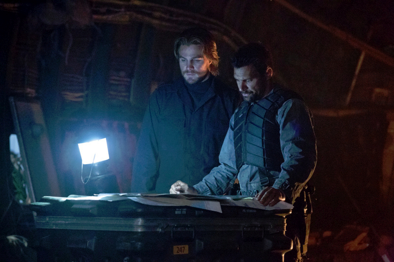 Arrow -- "The Odyssey" -- Image AR114c_8971b -- Pictured (L-R): Stephen Amell as Oliver Queen and Manu Bennett as Slade Wilson -- Photo: Jack Rowand/The CW -- © 2013 The CW Network. All Rights Reserved.