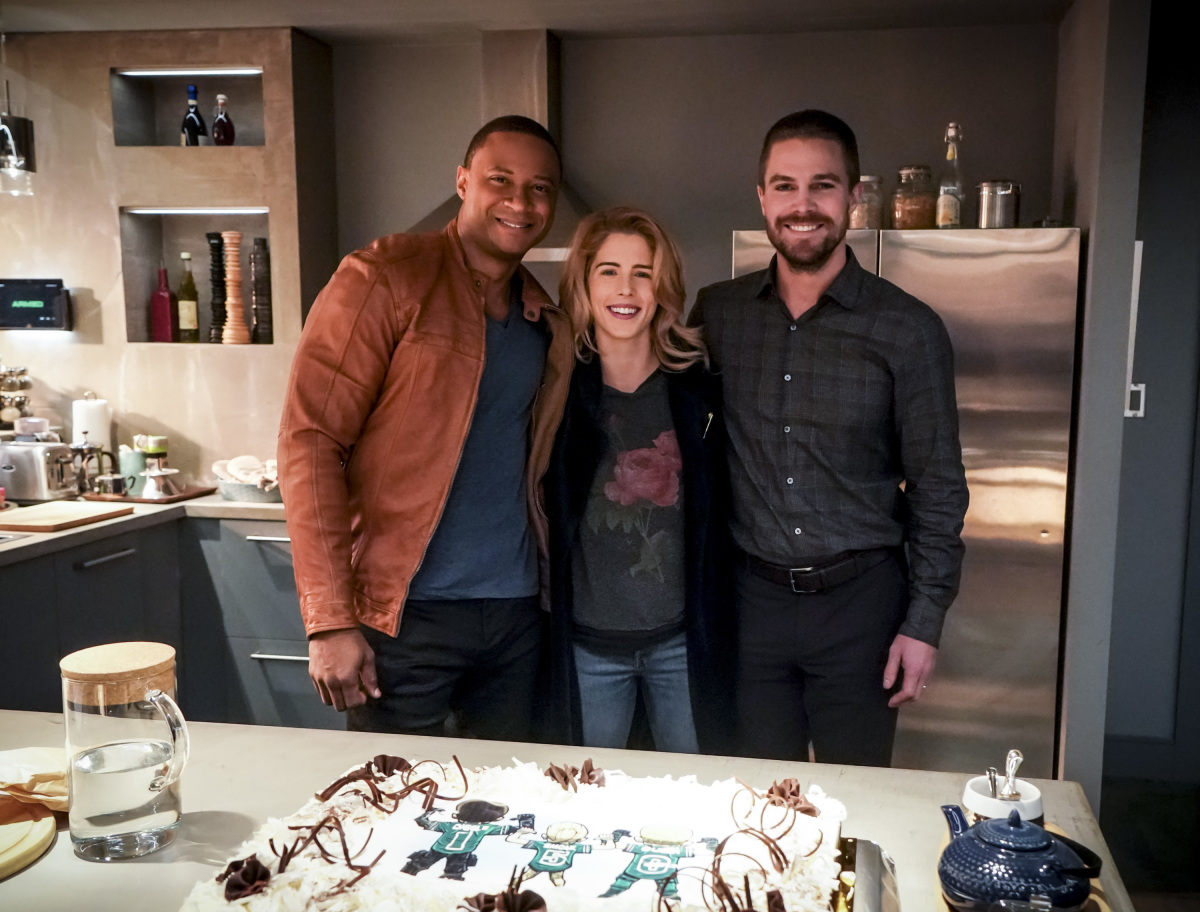 The episode airs February 4. Here’s how they describe it; the photos follow below. Some of the photos within are behind the scenes shots and a picture of “OTA” Stephen Amell, Emily Bett Rickards, and David Ramsey with a special Episode 150 cake!