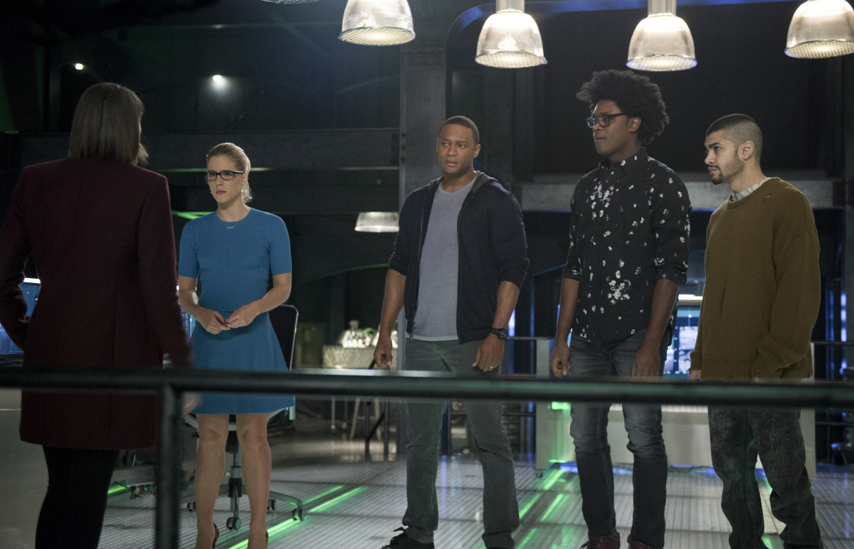 Arrow -- "Fighting Fire With Fire" -- Image AR515a_0083b.jpg -- Pictured (L-R): Willa Holland as Thea Queen, Emily Bett Rickards as Felicity Smoak, David Ramsey as John Diggle, Echo Kellum as Curtis Holt and Rick Gonzalez as Rene Ramirez -- Photo: Diyah Pera/The CW -- é 2017 The CW Network, LLC. All Rights Reserved.