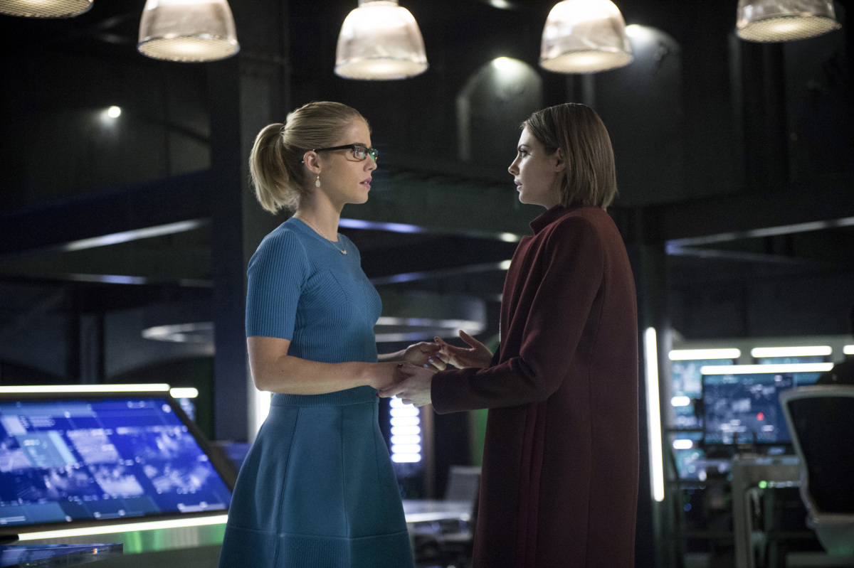 Arrow -- "Fighting Fire With Fire" -- Image AR515a_0087b.jpg -- Pictured (L-R): Emily Bett Rickards as Felicity Smoak and Willa Holland as Thea Queen -- Photo: Diyah Pera/The CW -- © 2017 The CW Network, LLC. All Rights Reserved.