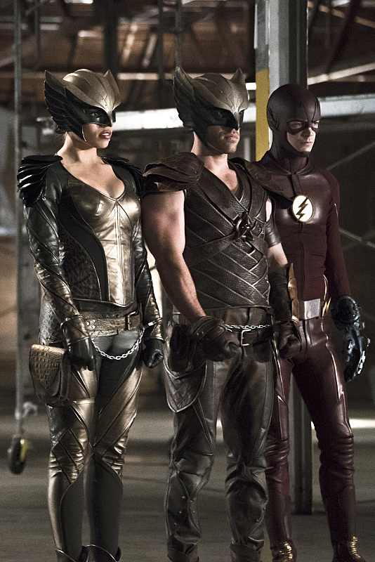 Arrow -- "Legends of Yesterday" -- Image AR408B_0251b.jpg -- Pictured (L-R): Ciara Renee as Hawkgirl, Falk Hentschel as Hawkman and Grant Gustin as The Flash -- Photo: Katie Yu/ The CW -- © 2015 The CW Network, LLC. All Rights Reserved
