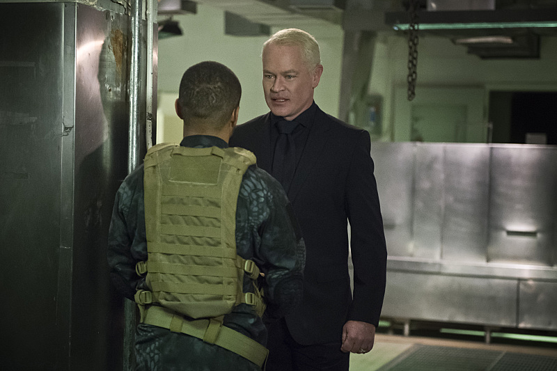 Arrow -- "Genesis" -- Image AR420a_0407b.jpg -- Pictured (L-R): Eugene Byrd as Andy Diggle and Neal McDonough as Damien Darhk -- Photo: Diyah Pera/The CW -- © 2016 The CW Network, LLC. All Rights Reserved.