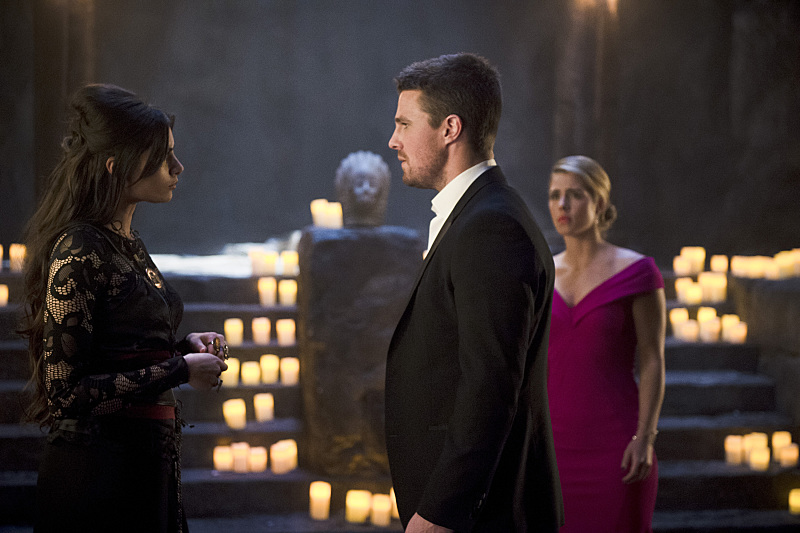 Arrow -- "Genesis" -- Image AR420b_0080b.jpg -- Pictured (L-R): Gabriella Wright as Esrin Fortuna, Stephen Amell as Oliver Queen and Emily Bett Rickards as Felicity Smoak -- Photo: Diyah Pera/The CW -- © 2016 The CW Network, LLC. All Rights Reserved.