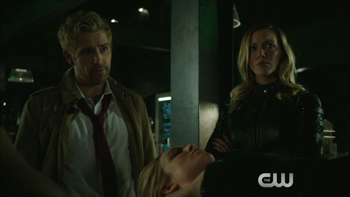 The episode features a guest appearance by Matt Ryan as John Constantine of Constantine fame, and Constantine is featured in this clip with all of Team Arrow as they try to save Sara Lance’s soul. (Still so weird seeing Lance in the lair!)