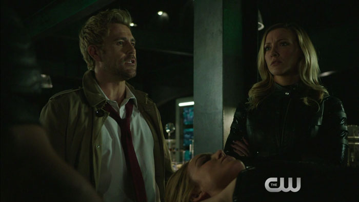 The episode features a guest appearance by Matt Ryan as John Constantine of Constantine fame, and Constantine is featured in this clip with all of Team Arrow as they try to save Sara Lance’s soul. (Still so weird seeing Lance in the lair!)