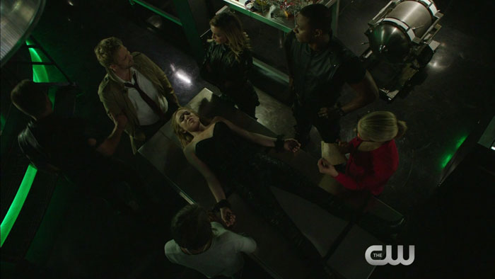 The episode features a guest appearance by Matt Ryan as John Constantine of Constantine fame, and Constantine is featured in this clip with all of Team Arrow as they try to save Sara Lance’s soul. (Still so weird seeing Lance in the lair!)