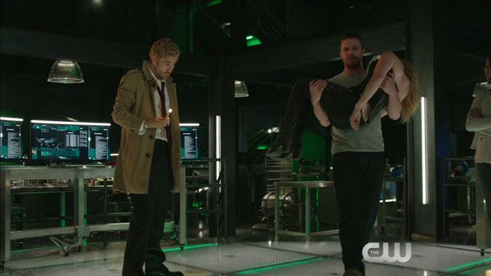 The episode features a guest appearance by Matt Ryan as John Constantine of Constantine fame, and Constantine is featured in this clip with all of Team Arrow as they try to save Sara Lance’s soul. (Still so weird seeing Lance in the lair!)