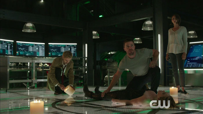 The episode features a guest appearance by Matt Ryan as John Constantine of Constantine fame, and Constantine is featured in this clip with all of Team Arrow as they try to save Sara Lance’s soul. (Still so weird seeing Lance in the lair!)