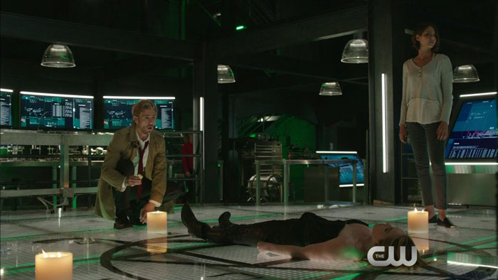 The episode features a guest appearance by Matt Ryan as John Constantine of Constantine fame, and Constantine is featured in this clip with all of Team Arrow as they try to save Sara Lance’s soul. (Still so weird seeing Lance in the lair!)