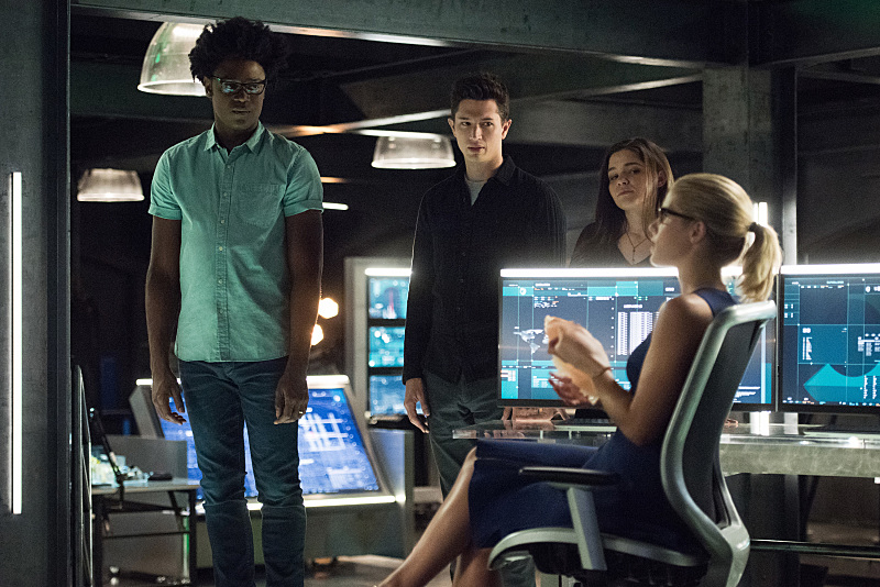 Arrow -- "Human Target" -- Image AR505a_0083.jpg -- Pictured (L-R): Echo Kellum as Curtis Holt, Joe Dinicol as Rory Regan/Ragman, Madison McLaughlin as Evelyn Sharp/Artemis, and Emily Bett Rickards as Felicity Smoak -- Photo: Dean Buscher/The CW -- é 2016 The CW Network, LLC. All Rights Reserved.