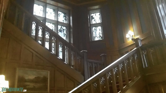 When a pilot episode is done, most of the sets are actual locations; when a show goes to series, it would be too costly to go on location all the time – though it does still happen – so several standing sets are created for the show. In the case of Arrow, we’ve got places like Walter Steele’s office, the warehouse with the famous salmon ladder… and the Queen mansion, which almost perfectly replicates the Hatley Castle in Victoria.