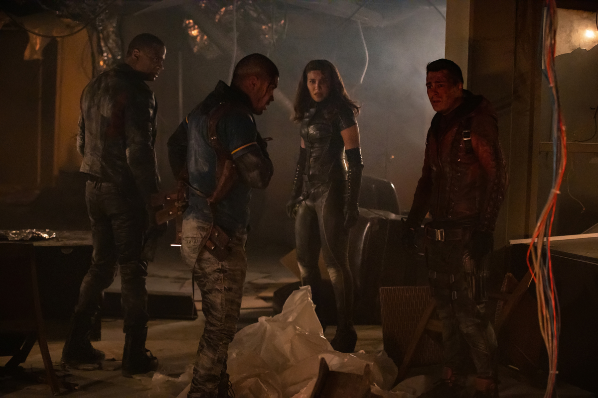 Arrow -- "Living Proof" -- Image Number: AR721a_0578r.jpg -- Pictured (L-R): David Ramsey as John Diggle/Spartan, Rick Gonzalez as Rene Ramirez/Wild Dog, Juliana Harkavy as Dinah Drake/Black Canary and Colton Haynes as Roy Harper -- Photo: Jack Rowand/The CW -- é 2019 The CW Network, LLC. All Rights Reserved.