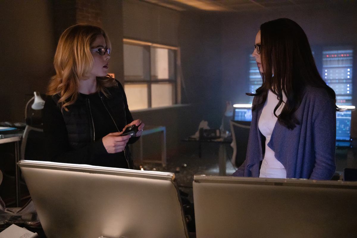 Arrow -- "Living Proof" -- Image Number: AR721a_0285r.jpg -- Pictured (L-R): Emily Bett Rickards as Felicity Smoak and Kacey Rohl as Alena Whitlock -- Photo: Jack Rowand/The CW -- © 2019 The CW Network, LLC. All Rights Reserved.
