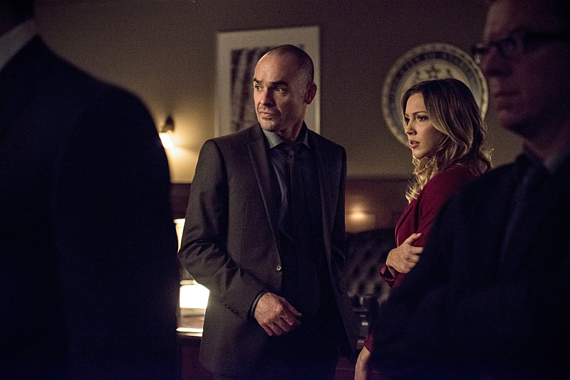Of course, she’s not the only Arrow cast member to be seen in these photos – we finally get some shots including Quentin (yay!) and Chase the DJ (boo!) Also present? Vinnie Jones as Danny “Brick” Brickwell, Emily Bett Rickards as Felicity, Colton Haynes as Roy, and Willa Holland and John Barrowman as the Merlyn daughter/father team! There’s even a little bit of Ray Palmer (Brandon Routh)  and Lyla (Audrey Marie Anderson) from what we can see. The only ones missing, it seems, are Oliver Queen (he’s dead) and Diggle, who is probably off being awesome somewhere.