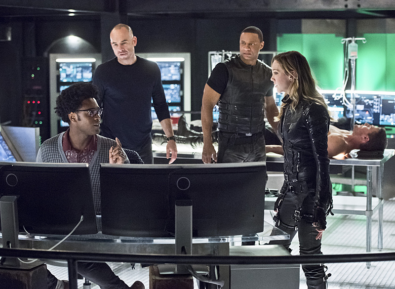 Arrow -- "Beacon of Hope" -- Image AR417a_0432b.jpg -- Pictured (L-R): Echo Kellum as Curtis Holt, Paul Blackthorne as Detective Quentin Lance, David Ramsey as John Diggle, Katie Cassidy as Laurel Lance and Stephen Amell as Oliver Queen -- Photo: Dean Buscher/The CW -- é 2016 The CW Network, LLC. All Rights Reserved.