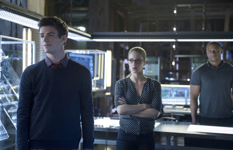 Arrow -- "Three Ghosts" -- Image AR209b_0218b -- Pictured (L-R): Grant Gustin as Barry Allen, Emily Bett Rickards as Felicity Smoak, and David Ramsey as John Diggle -- Photo: Diyah Pera/The CW -- © 2013 The CW Network, LLC. All Rights Reserved