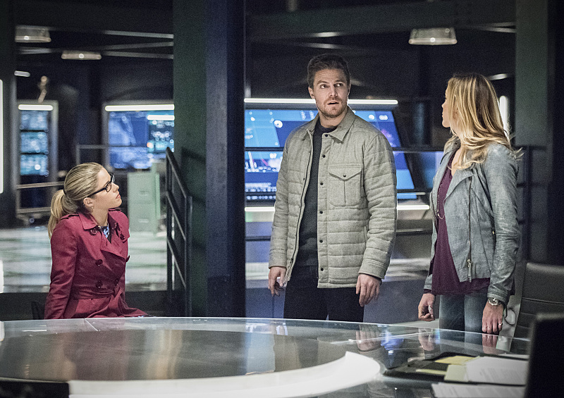 Arrow -- "Sins of the Father" -- Image AR413A_0099b.jpg -- Pictured (L-R): Emily Bett Rickards as Felicity Smoak, Stephen Amell as Oliver Queen and Katie Cassidy as Laurel Lance -- Photo: Dean Buscher/ The CW -- © 2016 The CW Network, LLC. All Rights Reserved.